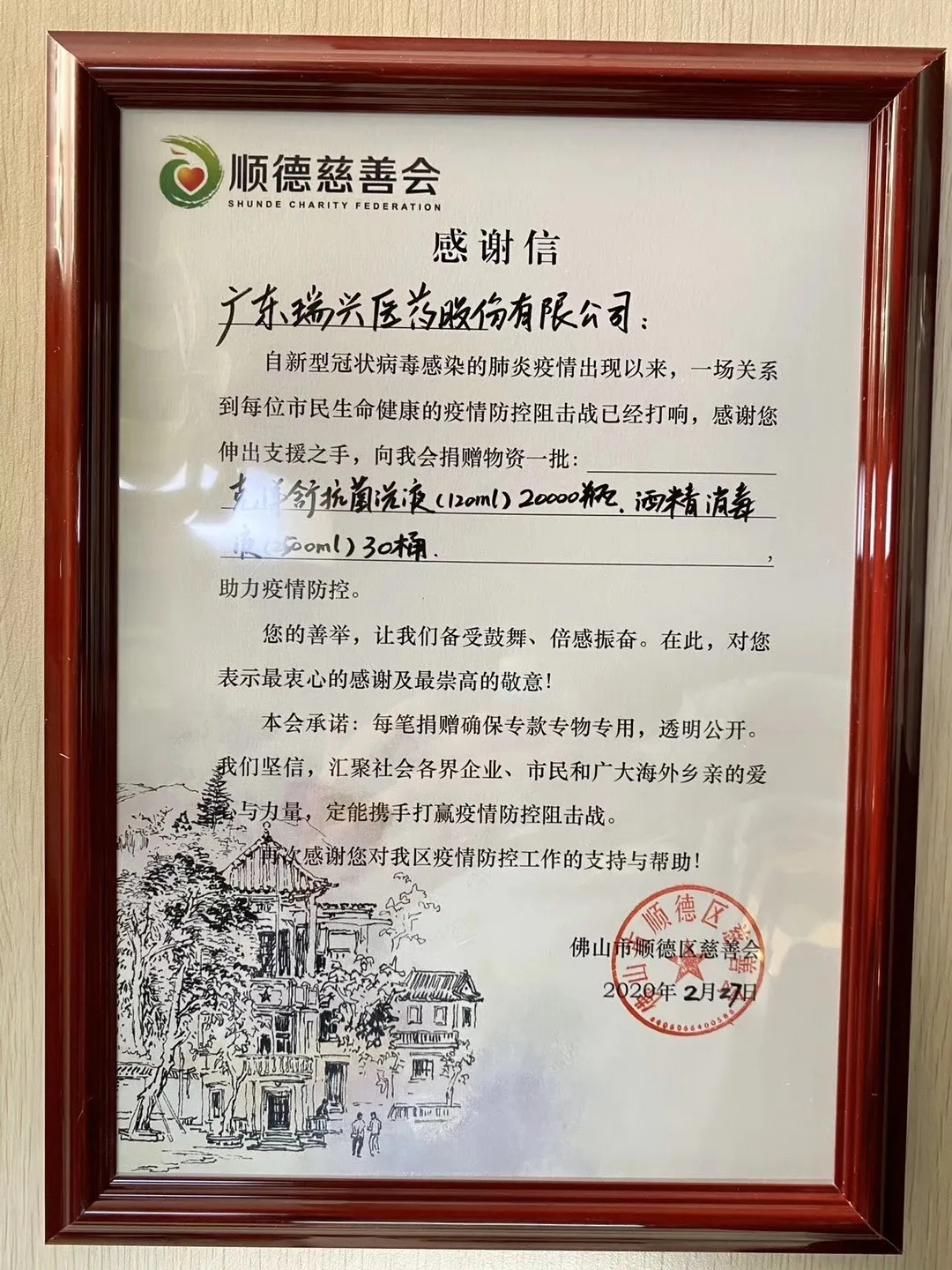 2月27日,為支援地方打贏這場疫情攻堅(jiān)戰(zhàn),廣東瑞興醫(yī)藥股份有限公司再次行動(dòng),愛心捐贈(zèng)一批由關(guān)聯(lián)企業(yè)——合肥華威藥業(yè)生產(chǎn)的抗菌消毒產(chǎn)品和酒精消毒液,通過順德區(qū)慈善會(huì)定向捐贈(zèng)給順德區(qū)市場監(jiān)督管理局用于辦公場所、農(nóng)貿(mào)市場、餐飲企業(yè)等公共場所及相關(guān)人員日常清洗消毒和滅菌使用。捐贈(zèng)產(chǎn)品能有效抑制病菌的交叉感染,為一線人員保駕護(hù)航。